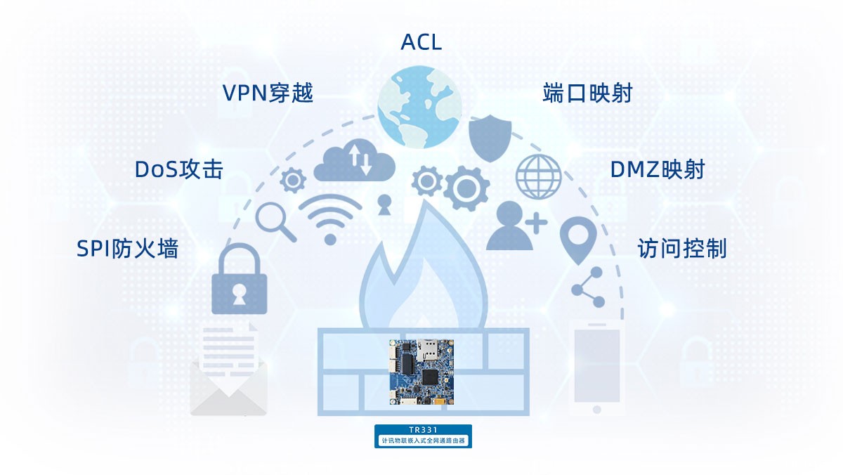 支持SPI防火墙,DoS攻击,VPN穿越,访问控制,端口映射、DMZ映射、访问控制功能(ACL)等功能。专业防护,以保网关和局域网内设备的安全。