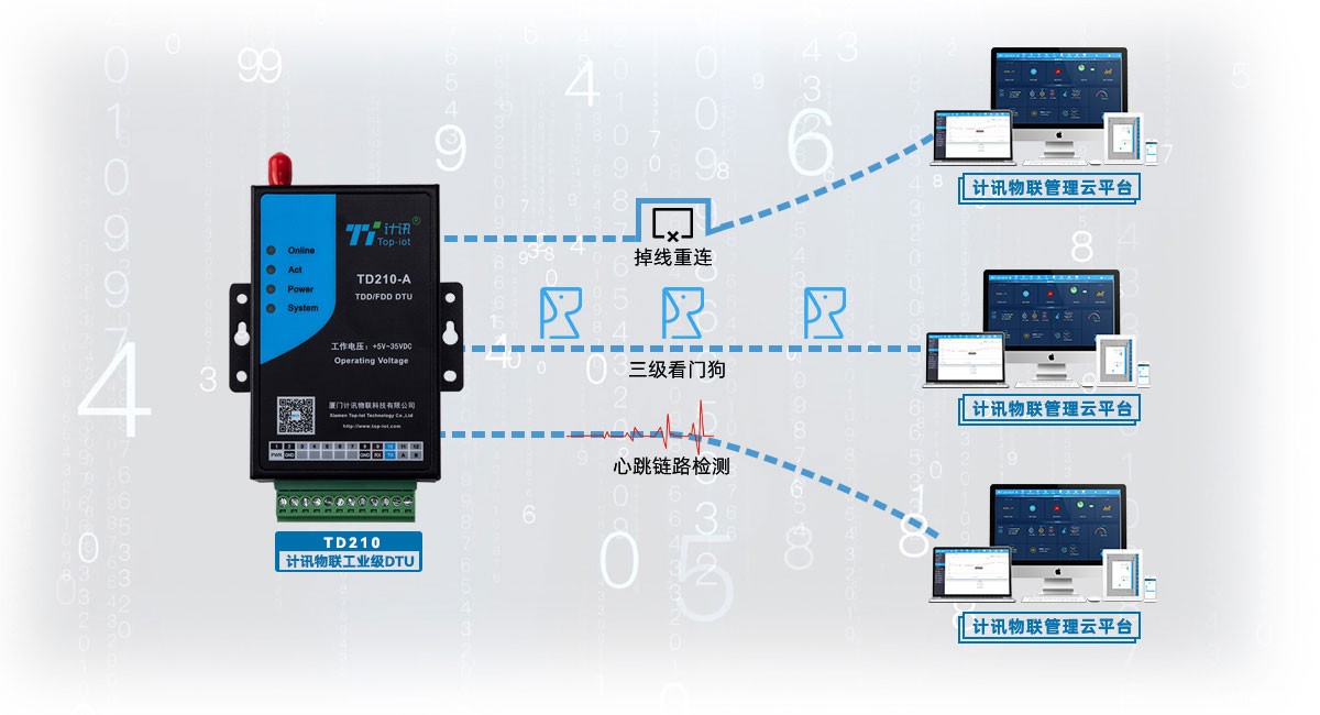 支持I/O、ADC、TTL/RS-232/RS-485多种接口选择(可定制TTL电平串口),兼容所有串口下位机;通过开发包简化开发难度,可实现数据传输、远程参数配置、重启动控制;支持串口AT协议,可在运行过程中切换到AT状态,进行参数配置、重启控制式;两路模拟量、三路开关量设计,可定制脉冲输出、脉冲计数和模拟量输入功能;内嵌PPP、TCP/IP、UDP/IP、MODBUS-TCP、 MODBUS-RTU等多种协议,同时兼容国内主流厂家私有协议。