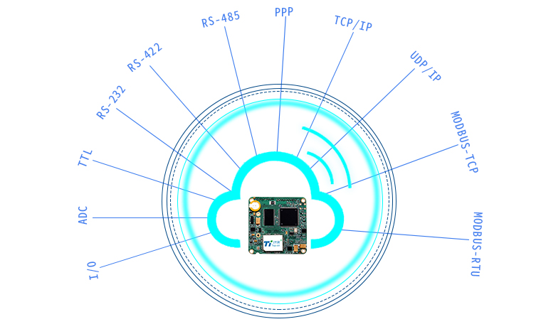 支持I/O、ADC、TTL/RS-232/RS-485多种接口选择(可定制TTL电平串口),兼容所有串口下位机;支持串口AT协议,可在运行过程中切换到AT状态,进行参数配置、重启控制式;两路模拟量、三路开关量设计,可定制脉冲输出、脉冲计数和模拟量输入功能;内嵌PPP、TCP/IP、UDP/IP、MODBUS-TCP、 MODBUS-RTU等多种协议,兼容厂家私有协议。