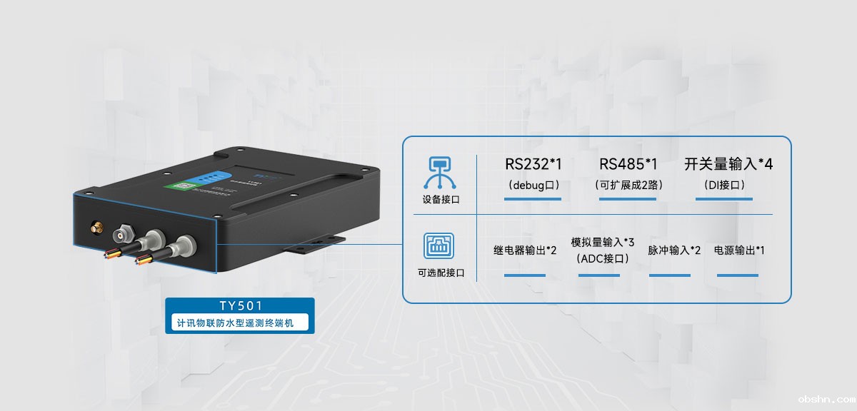 微型遥测终端机 | TY501优米平台app下载TY501系列RTU是一款集数据采集与2G 3G 4G数据传输功能于一体的微型水利数据遥测终端机,采用极简设计思路,实现水文水资源的关键数据采集、存储与控制、报警与传输等综合功能。
