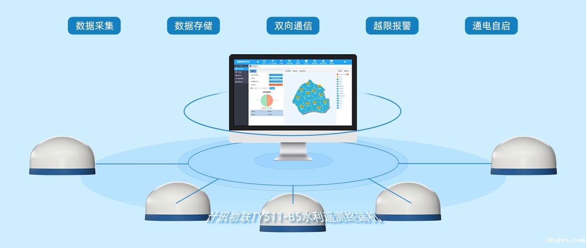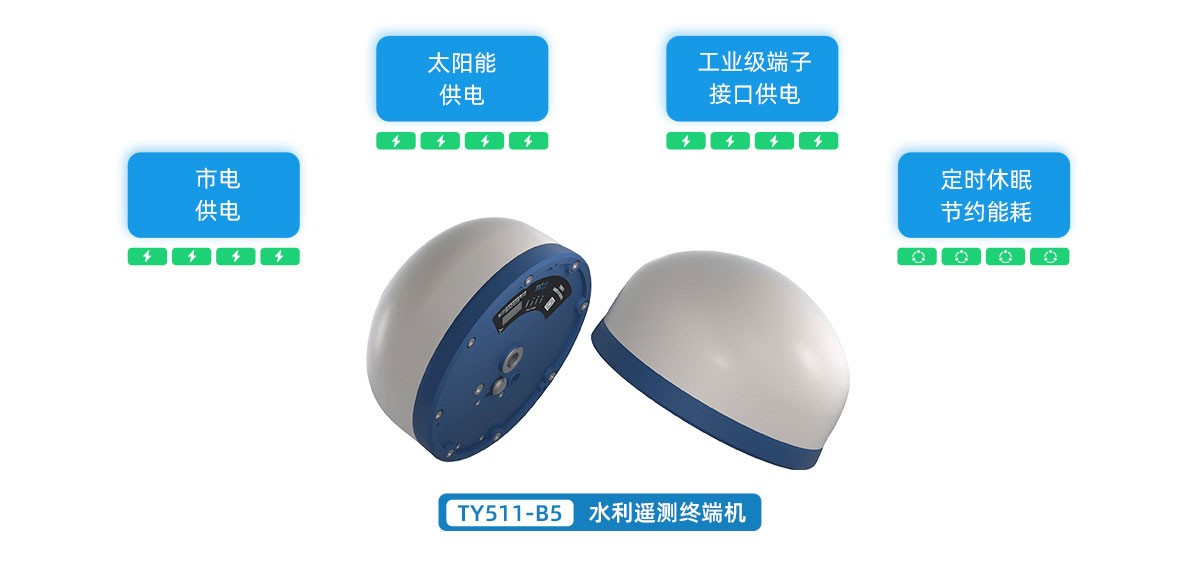 遥测终端机TY511-B5支持市电、太阳能供电、工业级端子接口供电,多方式为设备提供稳定电源,同时支持定时休眠,按需关闭4G通讯节约能耗,延长续航时间。