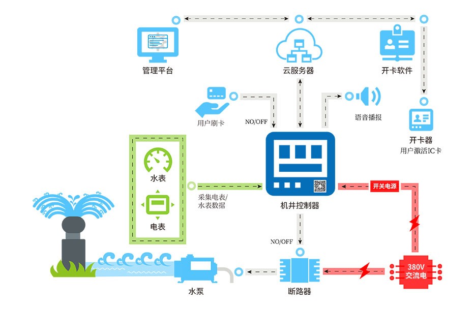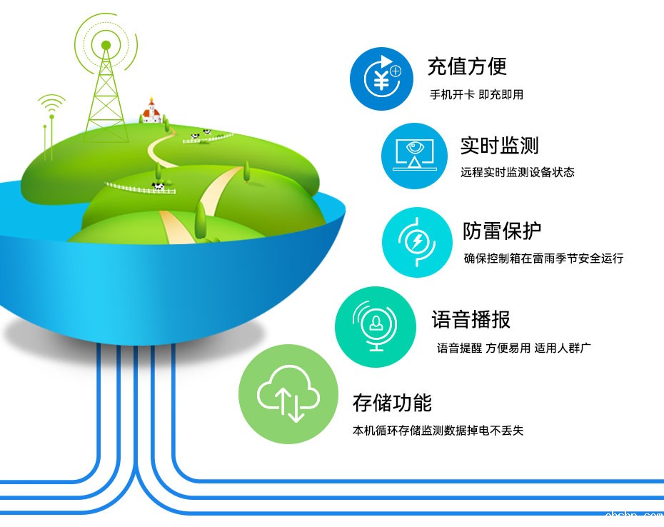 NFC技术:无线读卡、防复制、防消磁、防水防潮;充值方便:手机开卡 即充即用;存储功能:本机循环存储监测数据,掉电不丢失;语音播报:语音提醒 方便易用 适用人群广;实时监测:远程实时监测设备状态;防雷保护:确保控制箱在雷雨季节安全运行。