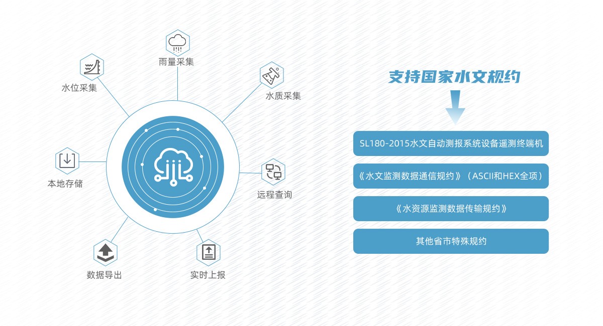 支持3个RS232接口、3个RS485接口、1个I2C接口、1个TTL电平串口、4路开关量输入接口、8路模拟量输入接口(12位AD、支持4-20mA电流或0-5V电压信号)、4路继电器输出、5路电源输出(外设供电)等可兼容采集多种水利传感器采集需求;支持WAN/LAN、ADSL、GPRS、4G、WIFI等满足不同环境下对远程通信的需求。