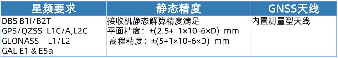 静态相对定位精度:平面±(2.5mm+1*10-6D)RMS,高程±(5mm+1*10-6D)RMS;