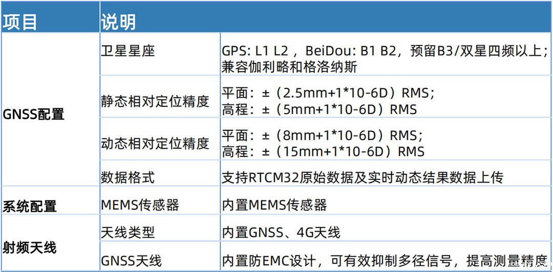 动态相对定位精度:平面±(8mm+1*10-6D)RMS;高程±(15mm+1*10-6D)RMS,精准定位监测。