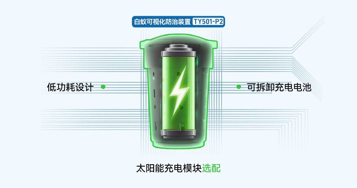 低功耗模式续航2年; 电池可拆卸充电循环使用; 选配太阳能充电模块实现持久续航 |