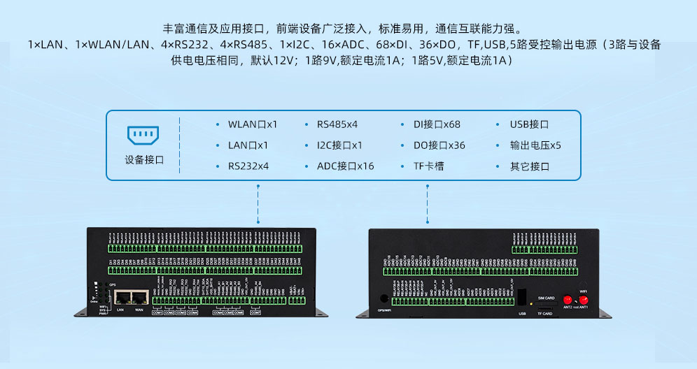 5路受控输出电源(3路输出电压值与设备供电电压相同,默认12V;1路输出9V,单路额定输出电流1A;1路输出5V,单路额定输出电流1A;内置过流保护) |