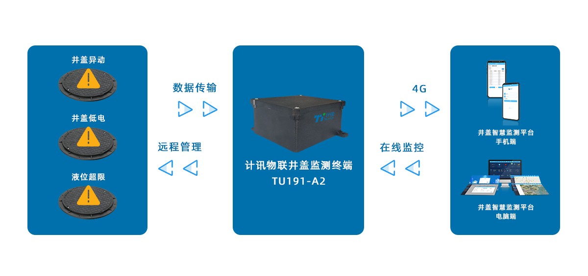 井盖监测终端TU191-A2,4G CAT.1稳定通信,低功耗设计超常待机,IP68高防护等级适用于雨水潮湿恶劣环境,支持井盖移动、倾斜、液位、气体监测,支持告警报警功能,电子标签分散设备远程统一管理,常用于城市供水井盖、供暖井盖、污水处理井盖、消防井盖等场景。
