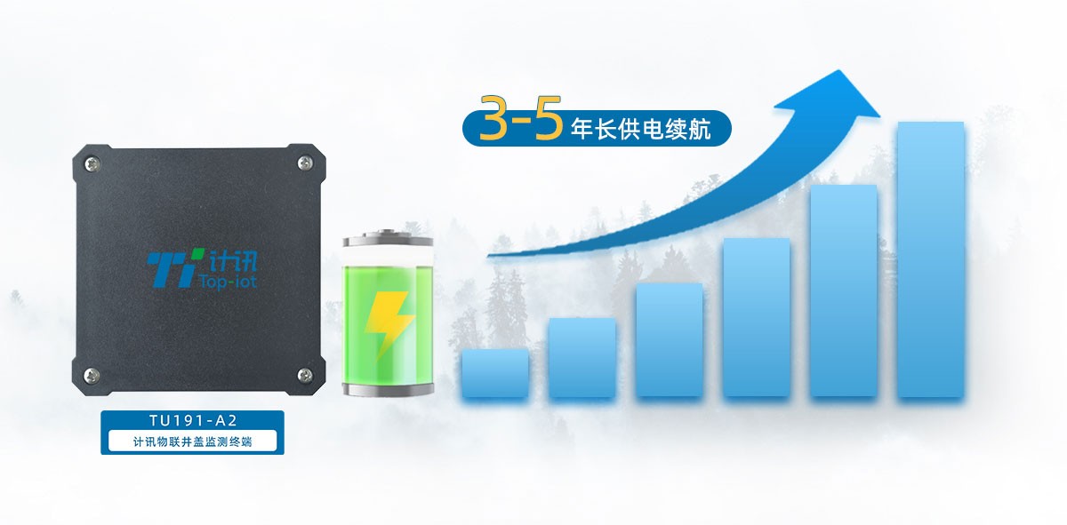 3.6V 4AH锂电池供电,无需外部电源,适用于井下环境使用,此外设备采用超低功耗设计,保证井盖监测终端TU191-A2的3-5 年长供电续航,持久耐用寿命更长。