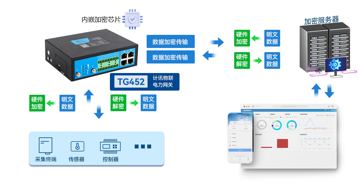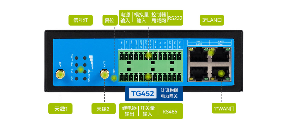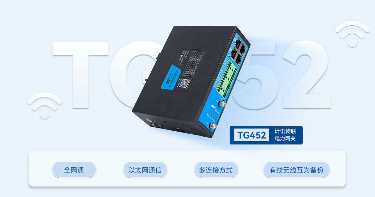 电力网关TG452,支持电力协议,适用于电力场景智能终端、电表等采集、协议转换、数据传输、在线监测、远程控制等智能化管理,性能稳定,多方式加密保障数据安全。