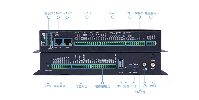 实现串口数据、模拟量、开关量信号、2路局域网数据等多渠道数据的采集,并转发至指定服务器统一管理,统一处理,进一步实现边缘计算数据的智能化管理。