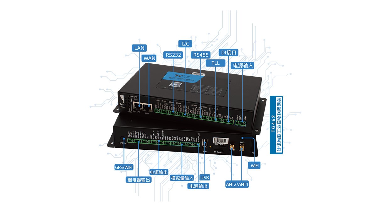 TG462 系列工业级物联网网关是一款采用ARM架构高能效处理器作为主控、采用Linux作为操作系统的嵌入式工业计算机。它结合开放、先进的软件功能,在工业应用现场端和平台服务器端作为通讯枢纽,实现工业现场的数据采集、通信协议转换和数据传输,为工业领域设备信息化和工业大数据应用提供高效、可靠的数据通道。支持IEC101、IEC104电力规约以及DL/T645国标电度表规约,支持1.4/1.81GHz电力专网,支持国网加密,适用于各电力系统。