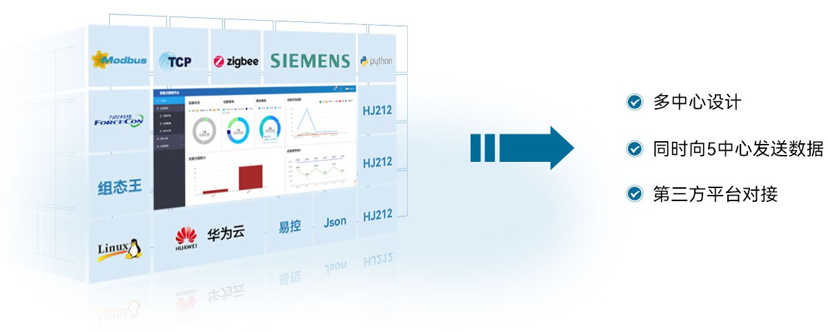 支持TCP/IP、UDP、MQTT、MODBUS RTU、MODBUS TCP 、HTTP、JSON、HJ212、等多种协议,支持定制私有通信协议;支持阿里云、百度云、华为云、亚马逊云等第三方云平台;支持国内主流组态软件:组态王、三维力控、易控等,支持企业私有云平台对接。