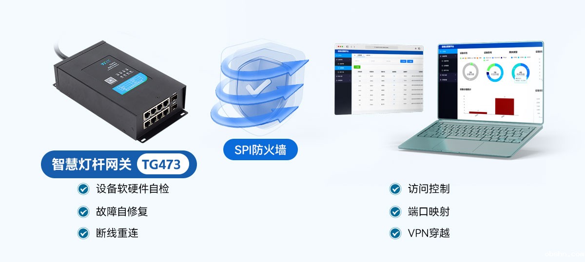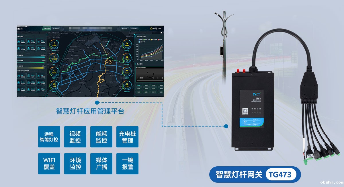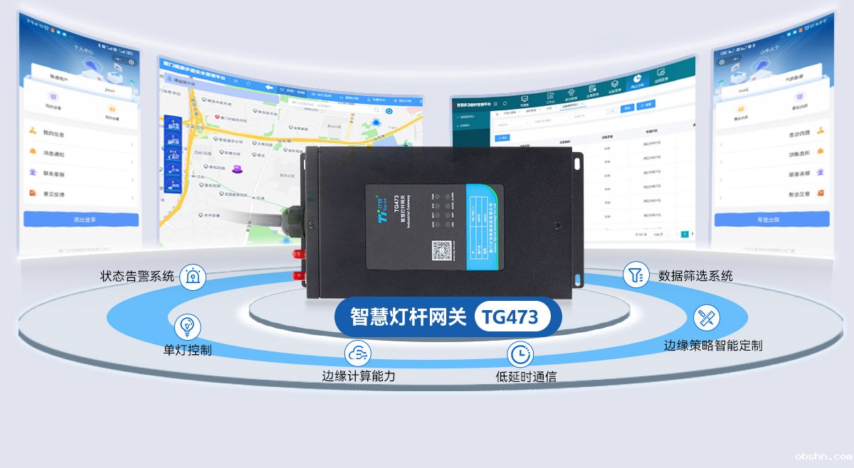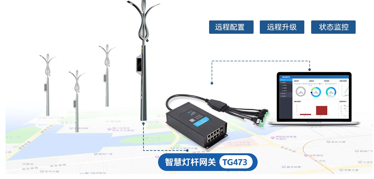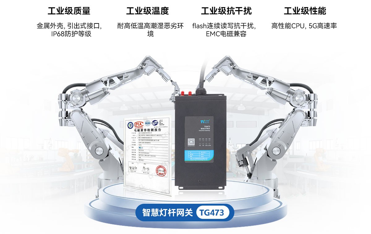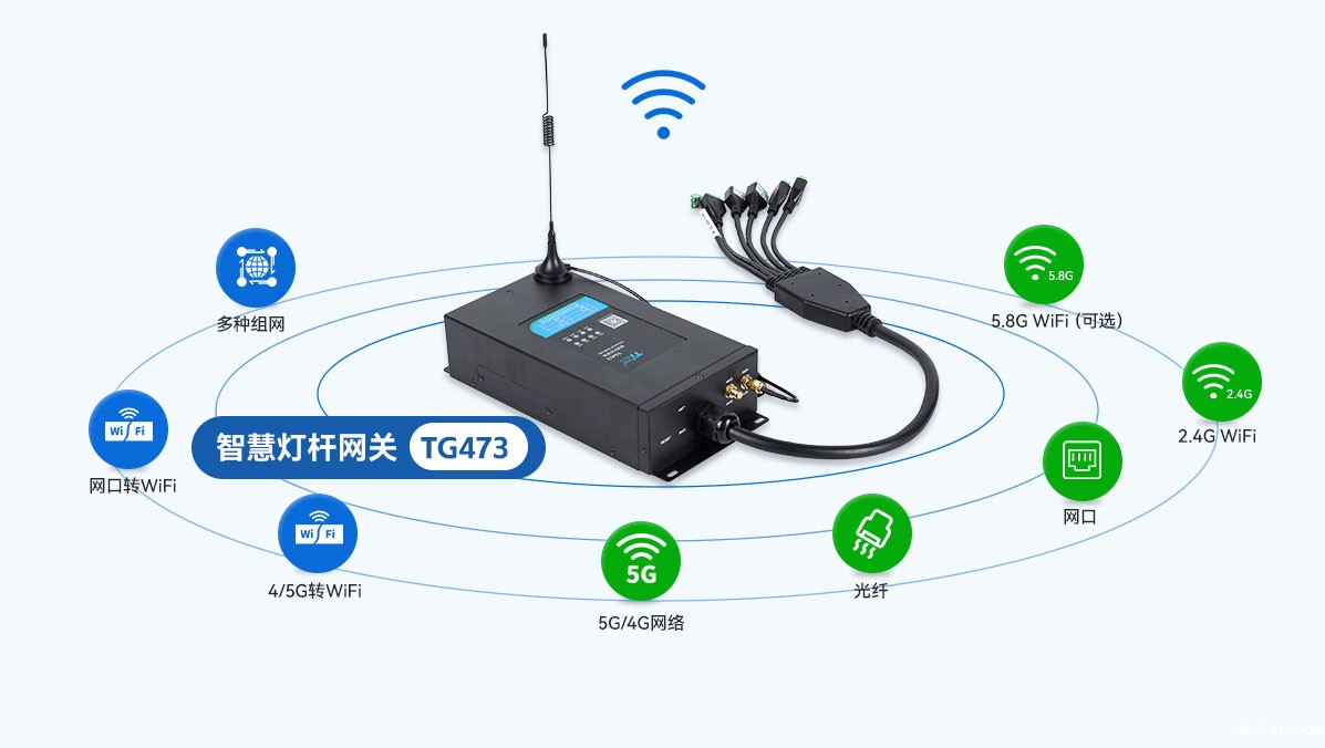 智慧灯杆专用网关TG473,引线式防水接口设计,支持5G/4G/WIFI/以太网通信,具备终端接入联网、数据采集、边缘计算、协议转换、数据传输、边缘控制、云平台对接等能力,实现智慧杆系统智能感知、远程控制、智慧管理。