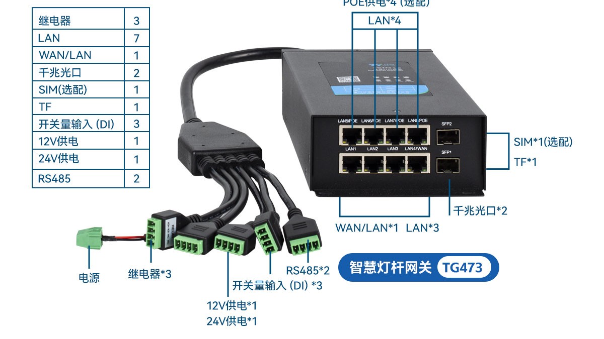 2路千兆光口、7×LAN千兆、1×WLAN/LAN千兆、2×RS485(含标配12v电源输出)、3×DI、3×继电器、SIM卡(可选)、TF卡、4×POE供电(可选)。
