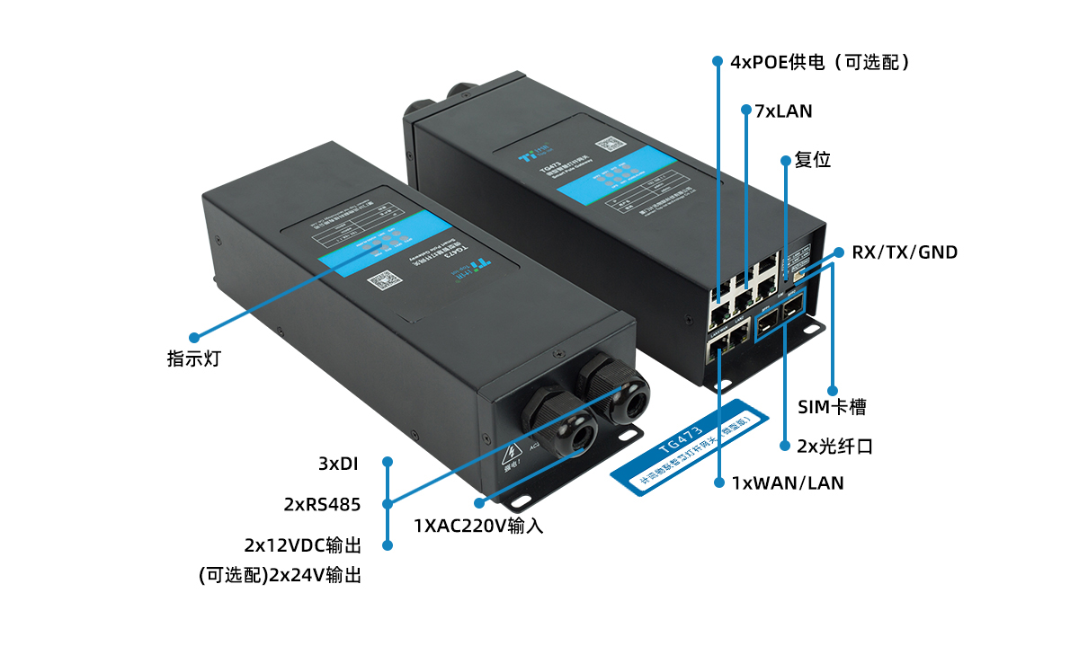 智慧灯杆网关TG473(不带强电版)智慧灯杆专用网关TG473,引线式防水接口设计,支持5G 4G WIFI 以太网通信,具备终端接入联网、数据采集、边缘计算、协议转换、数据传输、边缘控制、云平台对接等能力,实现智慧 -