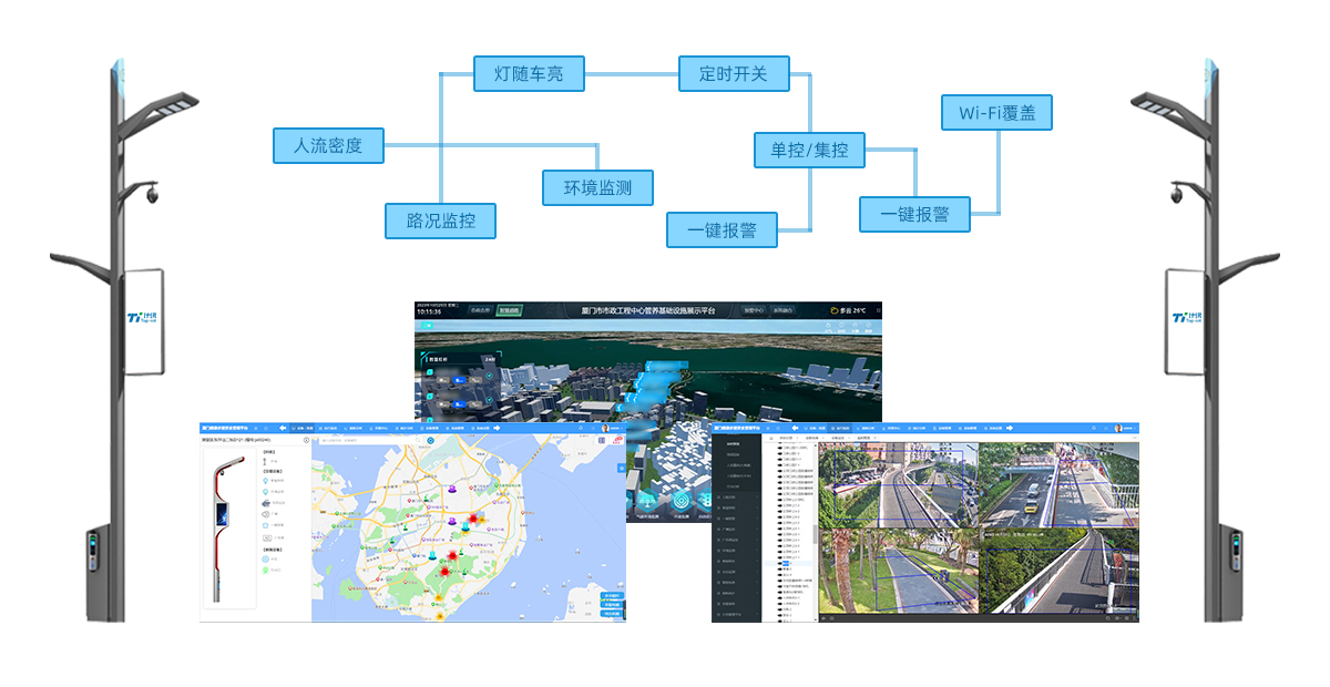 环境监测,路况监控(井盖、积水、拥堵),wifi覆盖,一键报警、摄像头、信息屏、音柱广播远程联动控制等多功能,对其进行集中化管理。
