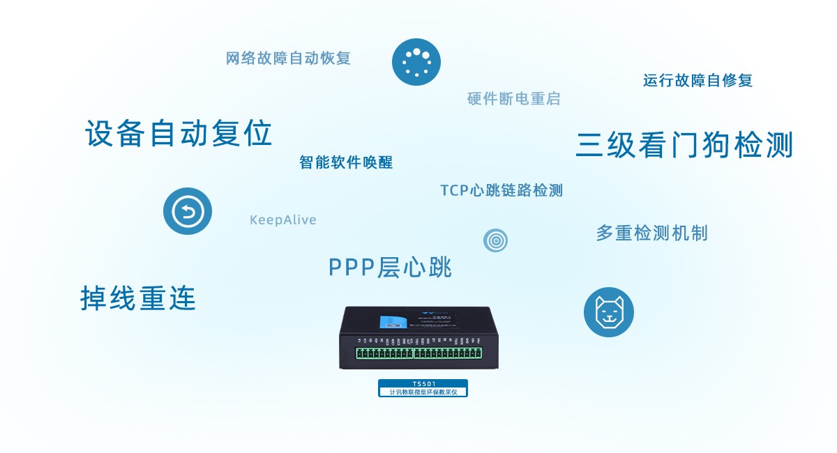 多重检测机制,运行故障自修复;三级看门狗检测机制,智能软件唤醒和硬件断电重启机制,设备自动复位;采用PPP层心跳、KeepAlive、TCP心跳链路检测机制、网络故障自动恢复、掉线重连确保设备永久在线。