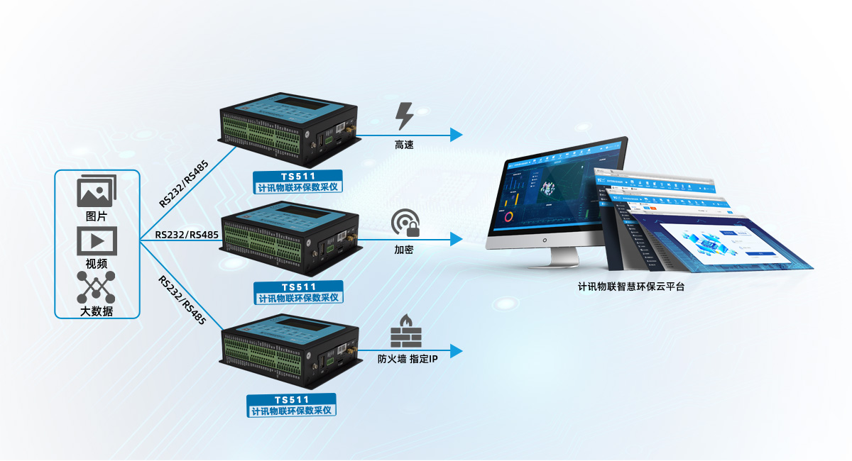 TS511环保数采仪,集视频图像监控、数据采集、数据存储、无线通信传输于一体;实现环保数据的采集、存储、显示、控制、报警及加密传输等综合功能;智能采集上报实时采集数据、设备监控数据等数据信息;接口丰富,可扩展性强、功能强大,组网灵活。