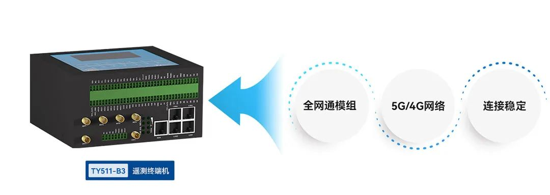 5G水利遥测终端TY511-B3是一款集数据采集与5G数据传输功能于一体的工业级远程测控终端。在接口设计方面,TY511-B3采用嵌入式设计方式,同时配备了丰富的接口,兼容各种类型的流量计、压力、水质分析仪、液位、工业串口摄像机、PLC等设备,可满足多样的工业数据数据采集需求。