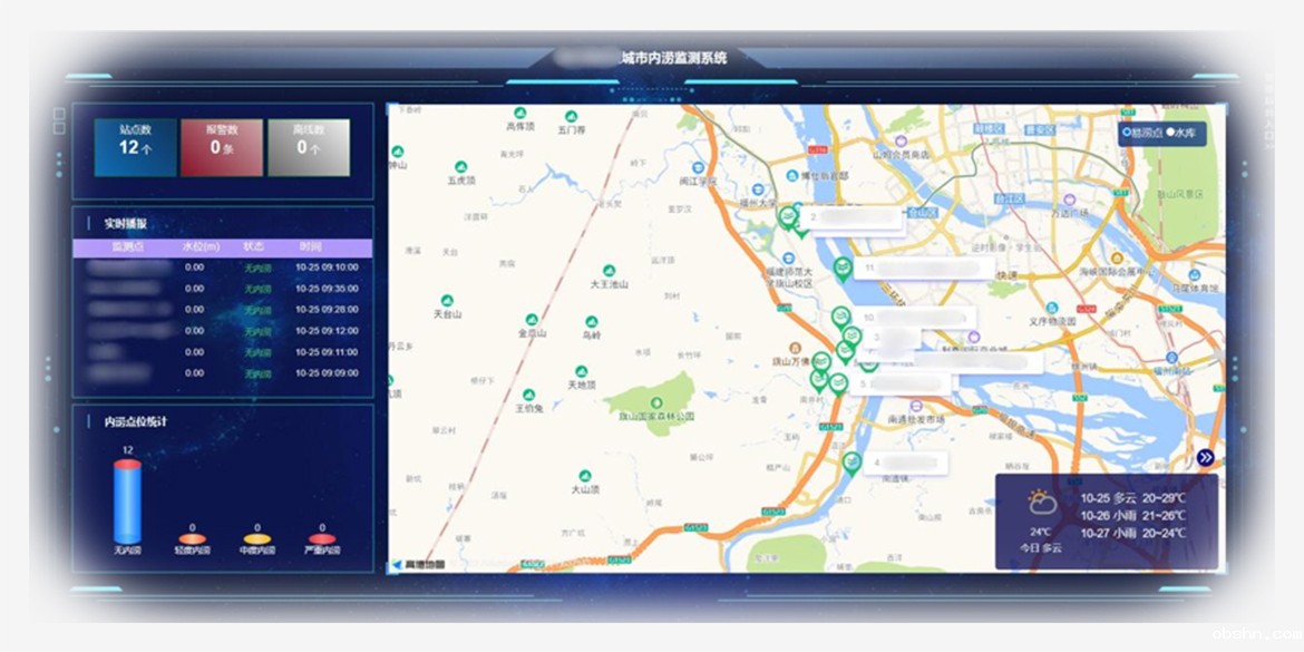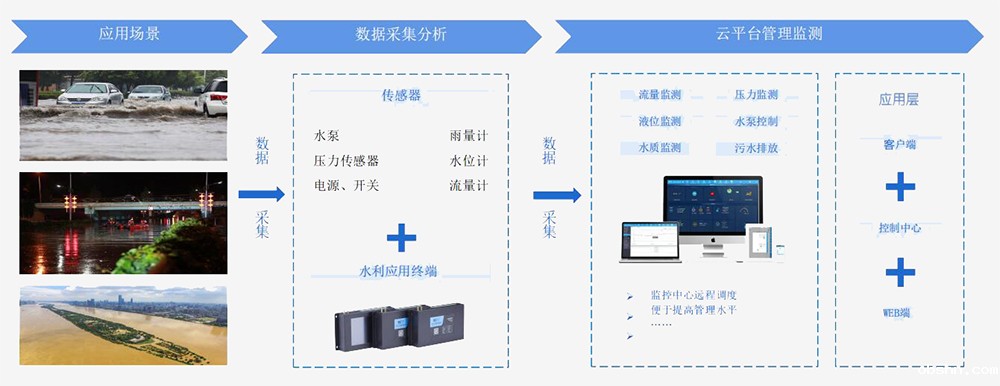 数据集成:结合雨量计、液位传感器、网络摄像头等传感器,对城市的水位、雨量、实时视频图像等进行采集存储和上报数据中心,实时监测城市积水情况。
