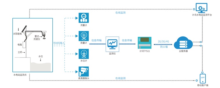 无线数据通讯:无线数据通讯部分通过 TY511水利遥测终端机使用3G/4G的无线传输方式将数据通过因特网传输到目的中心。使用无线数据传输的方式能节省很大的人力物力,做到便捷部署与维护简便。