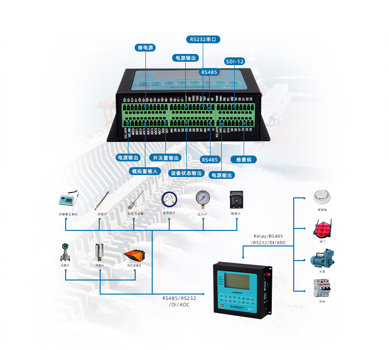 l 接口丰富,设备传感器仪器仪表等即插即用,配有网口、RS232接口、RS485接口、I2C接口、TTL电平串口、开关量、 模拟量、继电器输出、电源输出(外设供电)等,支持各类流量计、水位计、水质分析仪、雨量计、气象要素传感器、视频摄像头等仪器。