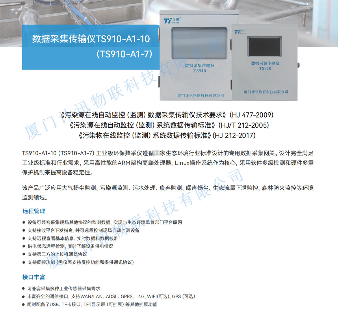 污染源在线监控用环保数采仪丰富网络接口及行业应用接口,支持各类传感器、检测仪器仪表、环保行业终端等接入,支持前端模拟量、开关量采集,支持5G/4G/WIFI/以太网/北斗通信,数据无线远传,对接 污染源在线自动监控系统平台、省市级环保部门管理平台、第三方定制平台,远程污染源治理设备工况监控、污染源排放数据监控、设备远程控制、视频图像监控,实现污染源排放源头监控、自动化监控、实时监测预警科学环保治理。
