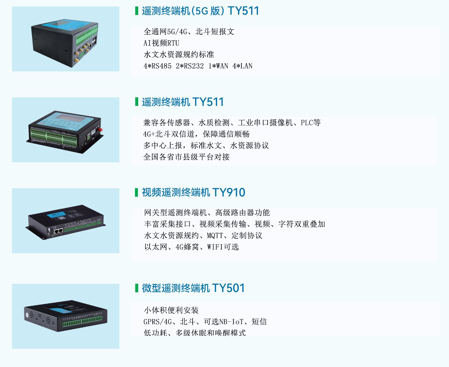 网关型遥测终端机 | TY910TY910系列RTU是一款集水文水资源、视频数据采集和逻辑控制功能于一体的工业级网关型遥测终端机,支持断电、断网续传和数据自动补发功能,保证数据完整性,可实现工业路由功能。 -